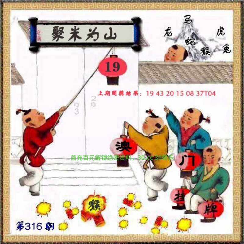 316期:一字記曰:【渴】 生命之源,不能缺莫,力争一瓢求解渴。求生本能,一定准确,象床玉手出新奇。《瑞》 解:沙恨无金尽日淘:尽日淘解蛇马兔龙羊猴。 生肖:蛇马兔龙羊猴 12码:13.49.24.36.03.15.02.14.11.35.22.46 |