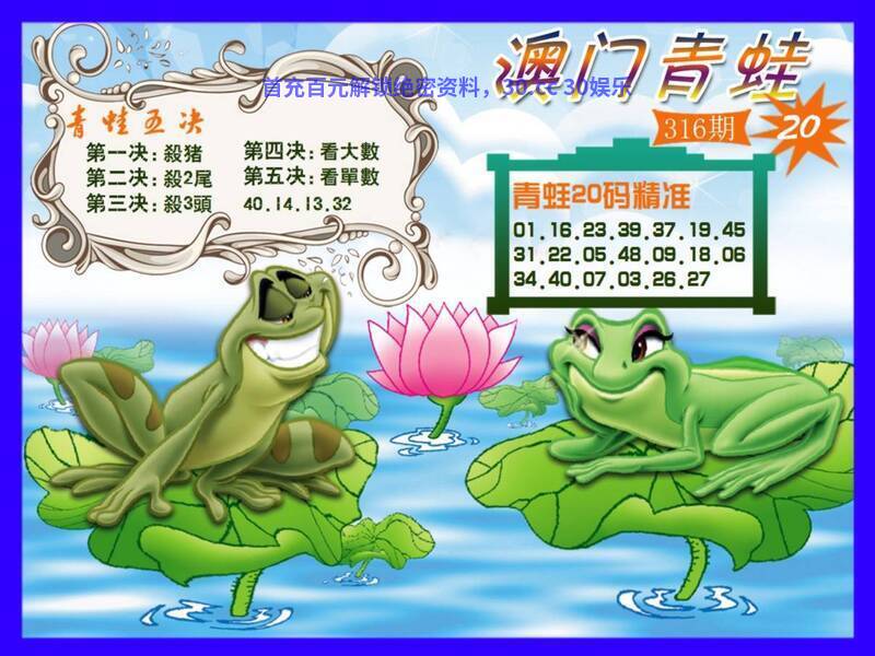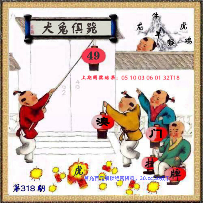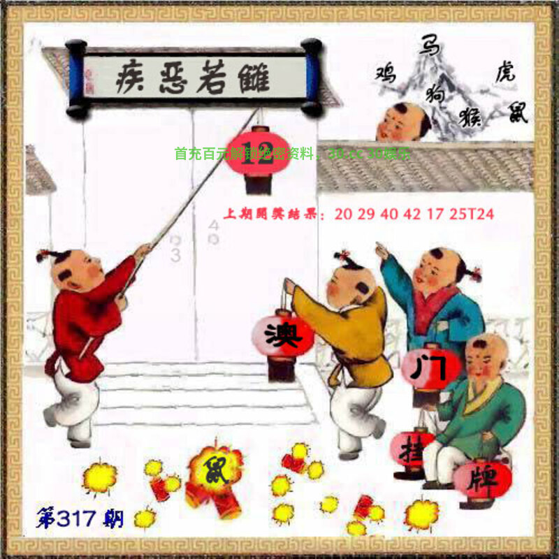 317期:澳门传真: 今期生肖一九开,狗打老鼠无功劳。 腊月冬季宰大猪,特定红绿满园春。 六合中间问缘分,时来运转码中游。 虎头蛇尾难成事,本期玄机诗中寻。 醇酒美人 今期腊月冬季宰大猪,解家禽生肖牛猪鸡羊狗马,特定红绿满园春,解红波。 综合:鸡猴羊鼠狗牛兔龙虎 主特:21.33.22.34.11.23.18.30.20.32.17.29 |